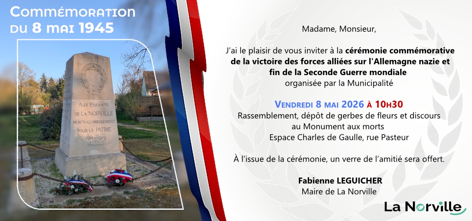 Cérémonie du 8 mai 1945 Le 08 mai 2026 à partir de 10h30 Citoyenneté Monument aux morts Mis à jour le jeudi 23 avril 2026 La cérémonie commémorative du 8 mai 1945 aura lieu vendredi 8 mai 2026 à 10h30 au Monument aux morts de La Norville. La rue Pasteur sera exceptionnellement fermée pendant la durée de la cérémonie.